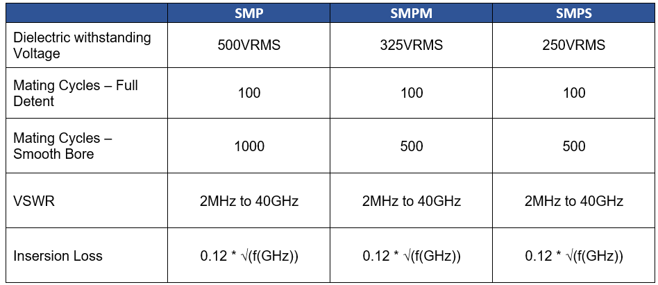 All three connectors offer a Voltage Standing Wave Ratio (VSWR) (2MHz to 40GHz) of 1.5:1 maximum and insertion loss of 0.12 (as seen in Table 1). They are rated for -65°C to +165°C operation and allow radial misalignment of up to 3°, and axial misalignment of .010” maximum.