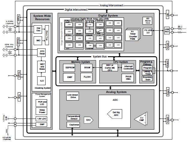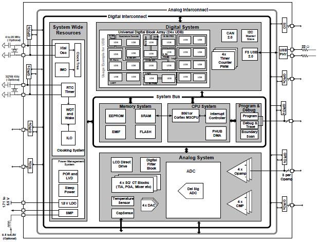 The CCY8C38 Precision Analog PSOC3 Family offers analog capability that spans the range from thermocouples (near DC voltages) to ultrasonic signals. The CY8C38 family can handle dozens of data acquisition channels and analog inputs on every general-purpose input/output (GPIO) pin. The CY8C38 family is also a high-performance configurable digital system with some part numbers including interfaces such as USB, Multimaster inter-integrated circuit (I2C), and controller area network (CAN).